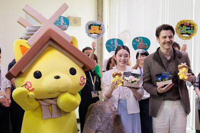 島根県庁のロビーでは、職員一同としまねっこが盛大な拍手と歓声でお出迎えし、職員から小泉八雲の著書『KWAIDAN』をモチーフにしたケースに入ったプリザーブドフラワーを贈呈させていただきました。